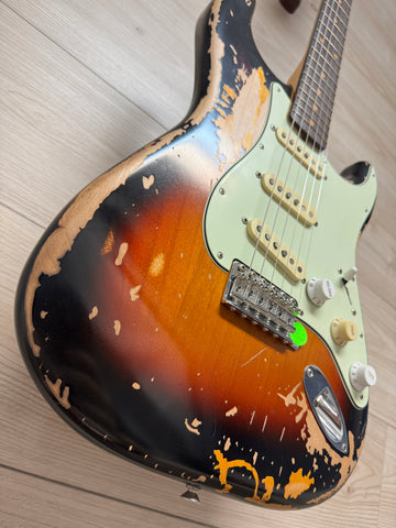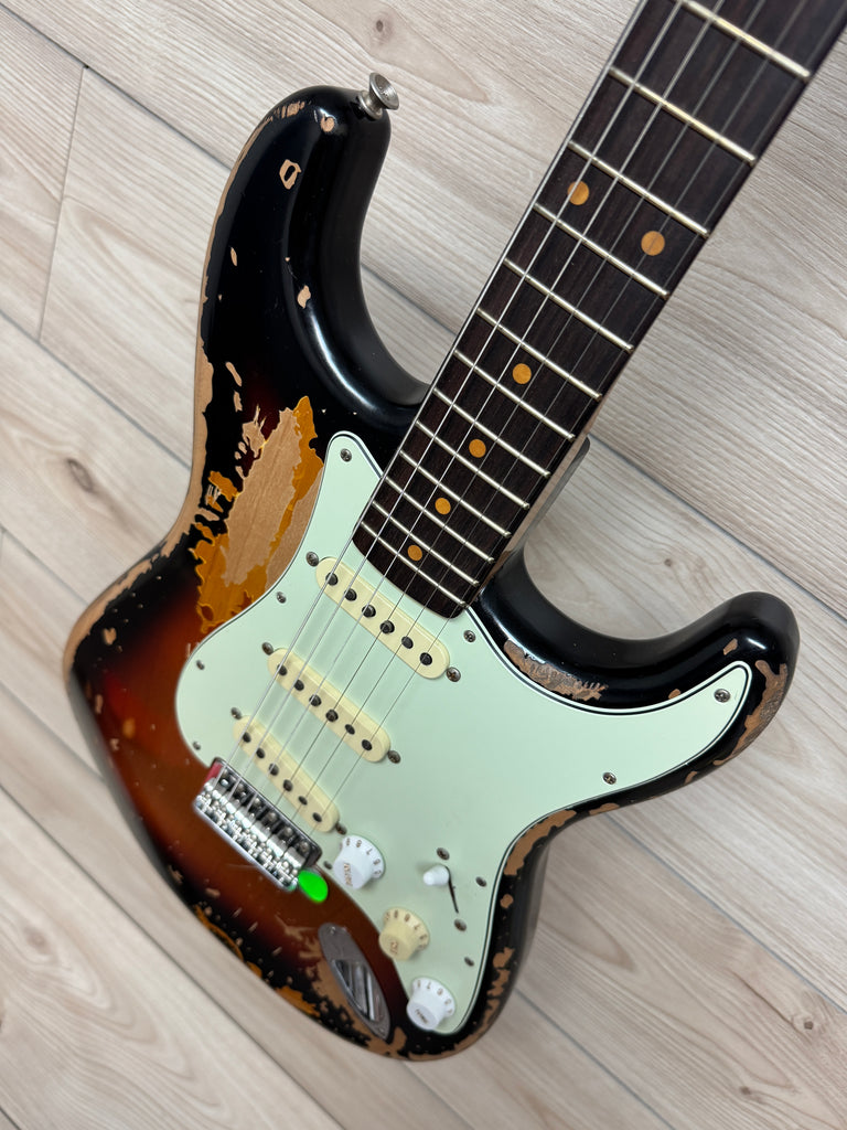 The Mike McCready Stratocaster® features a hand-crafted, heavily Road Worn® lacquer finish over an alder body, recreating the battle scars Mike's own Strat has earned over three decades of grueling, sold-out tours and legendary performances. The comfy 9.5" radius slab rosewood fingerboard on a slim "C" maple neck are shaped to match McCready's treasured 1960 Strat, while the custom Mike McCready Stratocaster pickups are voiced to replicate Mike's vintage single-coils for the same timeless tone, passion and energy that define his signature sound. The vintage-style synchronized tremolo, bent-steel saddles and cold-rolled steel block ensure the purest Fender tone and performance.