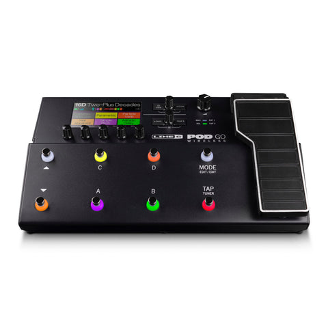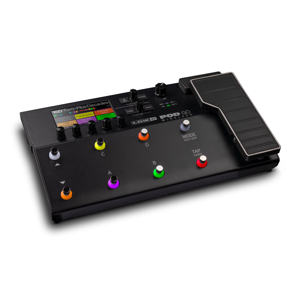 POD Go Wireless enables a simple and intuitive workflow. Choose, edit, and control sounds using the color LCD screen, five push encoders, eight rugged footswitches, and a cast-aluminum multi-function expression pedal—and add two external footswitches or a second expression pedal for even more real-time control. All the essential audio connections are at your fingertips, too, including balanced stereo outputs, a duplicate amp out that can be tapped before the Cab/IR, a stereo effects loop, a headphone jack, and even a USB port for accessing the 4-in/4-out audio interface with re-amping.