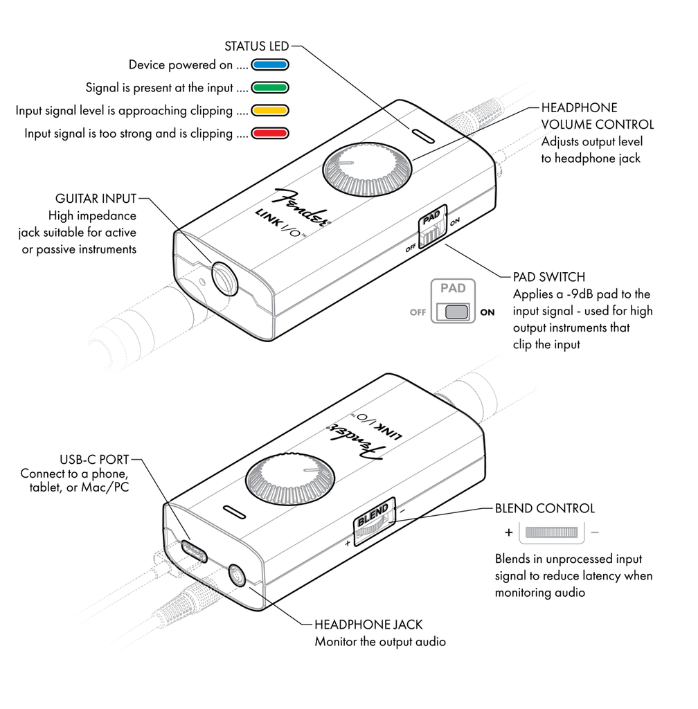 The perfect tool to capture your next riff, the Fender Link I/O™ is a studio-grade audio interface that can fit in your pocket. The Fender Link I/O provides pristine, bi-directional audio over USB connection, making it a one stop shop for connecting your instrument and headphones to your phone, tablet, Mac, or PC.