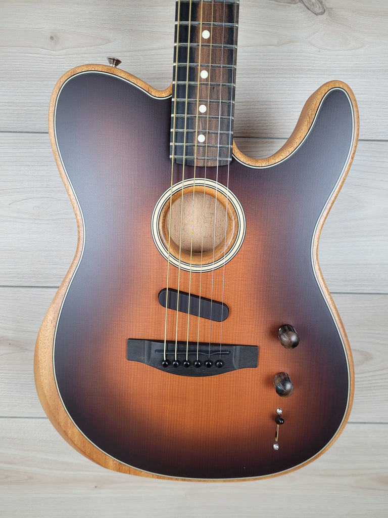 The American Acoustasonic® Telecaster® embodies the spirit of purposeful innovation that Fender was built on. From acoustic shape-shifting to electric rhythm tones, this powerful guitar uses a revolutionary Fender and Fishman®-designed Acoustic Engine to deliver new sonic expression from the studio to the stage.