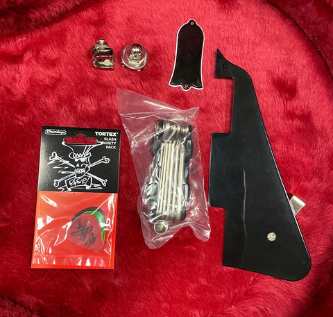 - Gibson Accessory Kit: Pickguard, Gibson Multi-tool, Gibson manual and warranty card and Gibson cleaning Cloth.